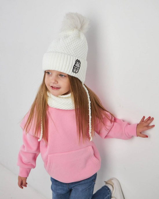 В'язаний зимовий комплект для дівчинки (шапка + хомут) на флісі для дівчинки, Мякий та приемний на дотик, Дуже теплий зігріє в холодну пору року. Розмір 48-54. Виготовлена з високоякісної пряжі. Склад: 30% acril, 70% wool.